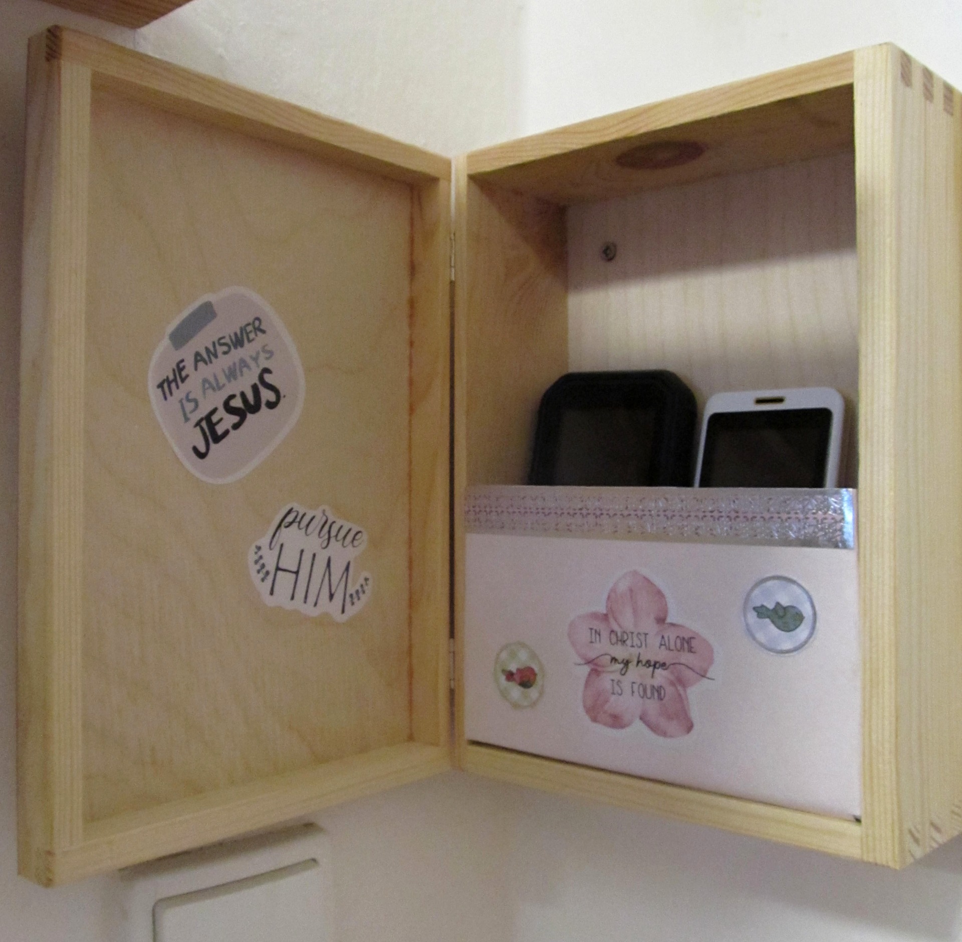 Domácí telefonní budku máme pověšenou na chodbě u dveří do kuchyně. Je dost na očích i pro ty, kdo k nám přichází, aby si i oni mohli svůj telefon odložit...